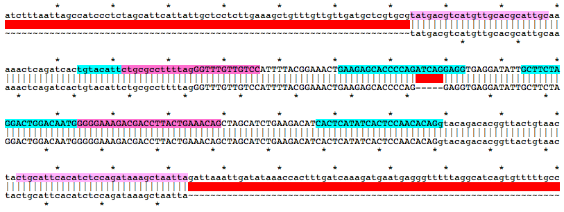Alignment of WT and Mutant Sequences w/ gRNA Targets (cyan) and Genotyping Primers (pink) Shown on WT Sequence