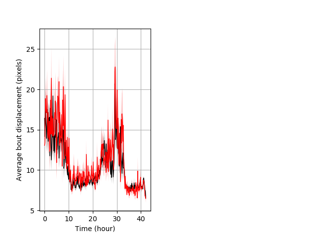 Features of movement entire protocol Graph Pvalue = 0.00684 Merged section Pvalue = 0.0196 30 het vs 18 hom ribgraph_mean_ribbonbout_aveboutdisp_10min_combo.png