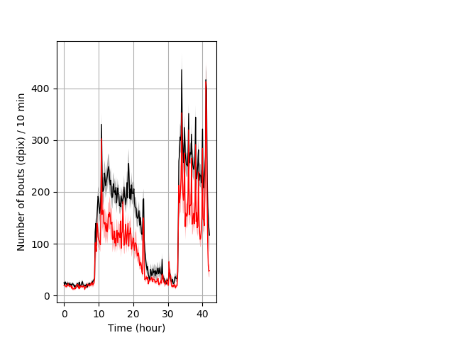 Frequency of movement entire protocol Graph Pvalue = 0.000561 Merged section Pvalue = 0.00403 30 het vs 18 hom ribgraph_mean_ribbonbout_dpixnumberofbouts_10min_combo.png
