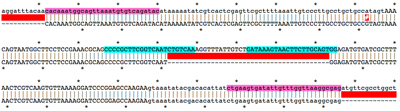 Alignment of WT and Mutant Sequences w/ gRNA Targets (cyan) and Genotyping Primers (pink) Shown on WT Sequence