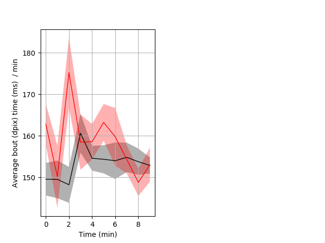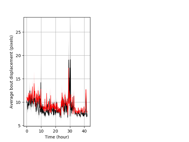 Features of movement entire protocol Graph Pvalue = 0.00207 Merged section Pvalue = 0.0163 18 het vs 26 hom ribgraph_mean_ribbonbout_aveboutdisp_10min_combo.png