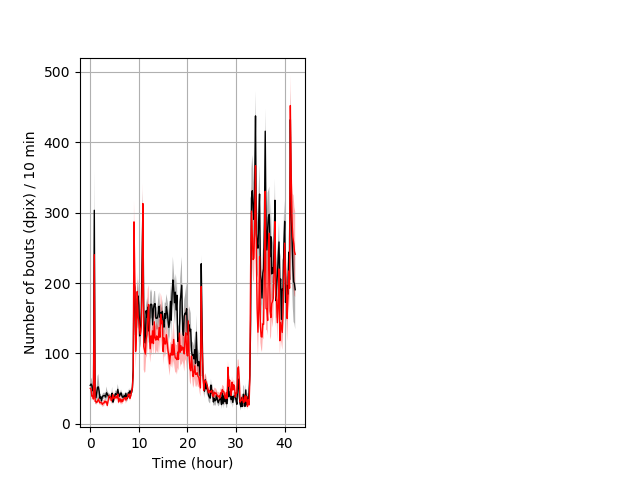 Frequency of movement entire protocol Graph Pvalue = 0.0401 Merged section Pvalue = not significant 15 wt vs 15 hom ribgraph_mean_ribbonbout_dpixnumberofbouts_10min_combo.png