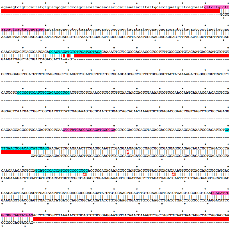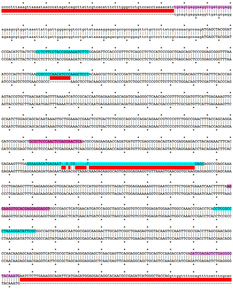 Alignment of WT and Mutant Sequences w/ gRNA Targets (cyan) and Genotyping Primers (pink) Shown on WT Sequence