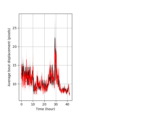 Features of movement entire protocol Graph Pvalue = not significant Merged section Pvalue = not significant 26 hethet vs 18 homhom ribgraph_mean_ribbonbout_aveboutdisp_10min_combo.png
