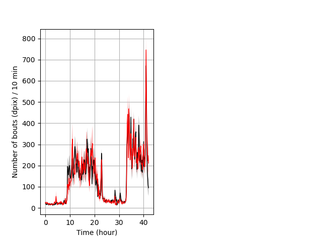 Frequency of movement entire protocol Graph Pvalue = not significant Merged section Pvalue = not significant 26 hethet vs 18 homhom ribgraph_mean_ribbonbout_dpixnumberofbouts_10min_combo.png